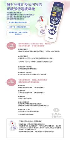 低周波隨身治療器(HVF128)3[1].jpg) ‧搭載12種選擇與5種精選模式 ‧使用者可依喜好調整頻率與區塊,進行不同強度的調整 ‧電源電壓:DC3V(使用2顆4號鹼性電池) ‧主體重量:約120g(含電池) ‧標準配件: ‧傳導線接線K型(1條)、貼片(1組2片裝)、4號電2顆、 ‧收納盒1個、軟帶1個、操作說明書1份 ‧外型尺寸:66 x 199 x 21 mm ‧保固期:1年 ‧日本原裝進口